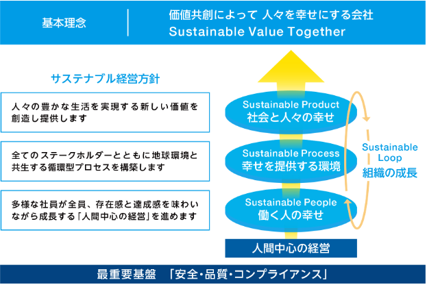 基本理念に掲げている「人々を幸せにする会社」を実現すべく、社員を含めた「人」を大切にし、サステナブルな経営によって地球環境にも配慮している企業であることが分かります。