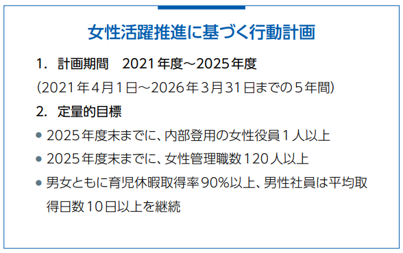 ダイキンは女性でも活躍できる環境が整っています。2021年4月に掲げた目標に、女性役員・基幹職数の比率向上や、育児休暇取得率など具体的な数値が掲載されています。