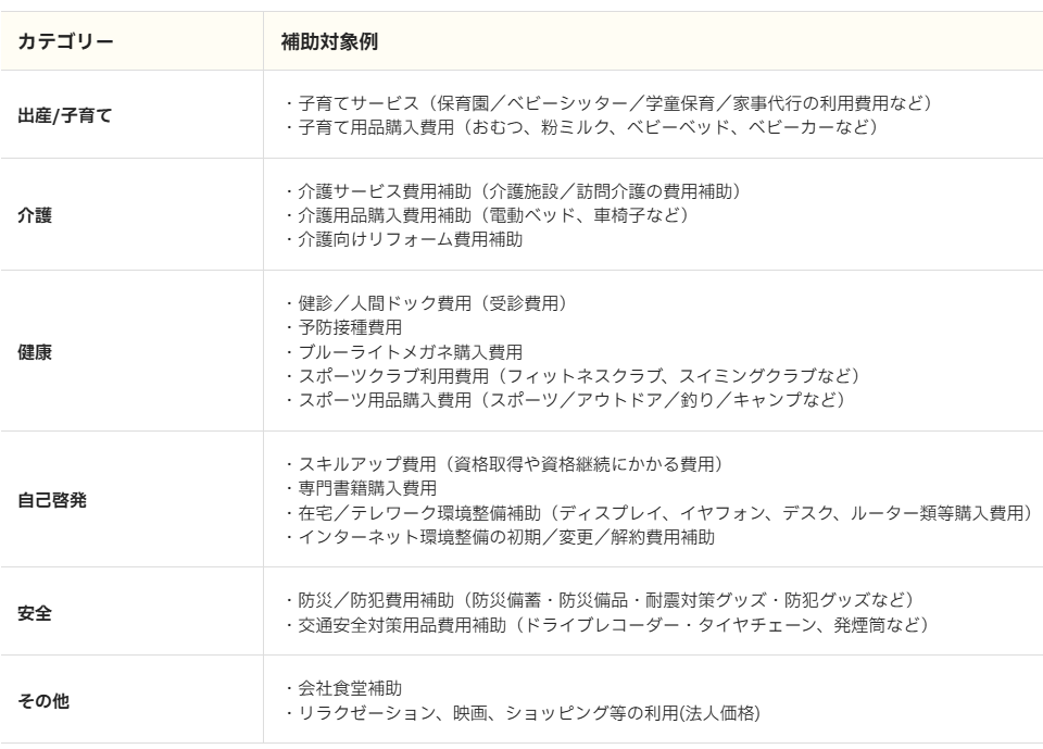また、選択型福利厚生制度が導入されており、毎年付与される福利厚生ポイントを使用し、子育て・介護・健康・自己啓発などさまざまなカテゴリーからメニューを選択して補助を受けることができます。加えて、契約会社の約4万件のサービス(例えば保育施設の入会金その他、スポーツ、グルメ、旅行などのサービス)を法人会員価格で利用することができます。