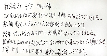 そんな中でさらに深く人生に関わる選択のお手伝いをしたいという想いから転職を決意。タイズに入社したのは、「単なるその場しのぎの転職ではなく、一生働き続けられる転職を」という今まで私が大事にしてきたスタンスを叶えられる企業であると感じたからです。大手・中堅優良メーカーを中心とした担当領域のキャリアコンサルタントとして幅広い職種の方々の転職支援をして参りました。