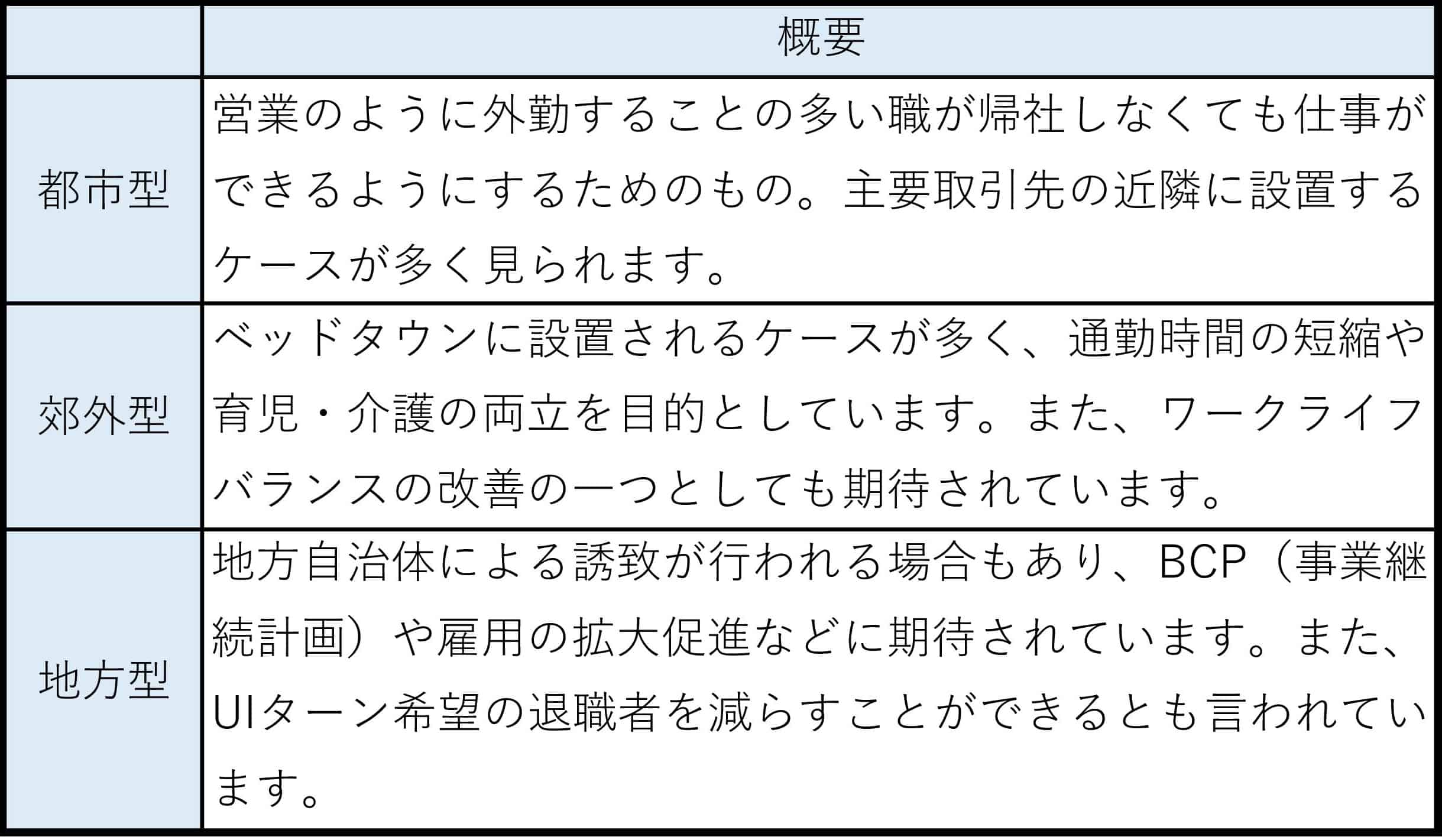 そんな「サテライトオフィス」には都市型・郊外型・地方型と大きく3つのタイプがあります。それぞれについて下の図のようにまとめてみました。