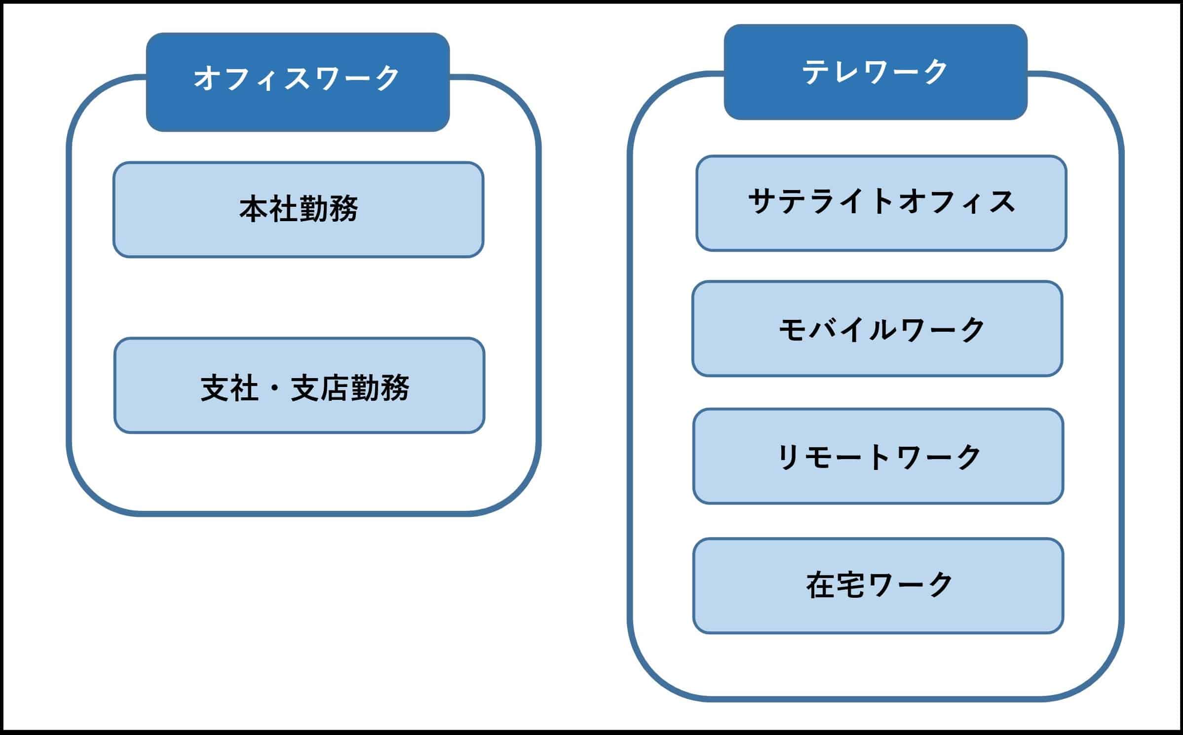 サテライトオフィスをはじめとして、働き方はますます多様化してきました。働き方を簡単に分類すると上の図のようになります。
