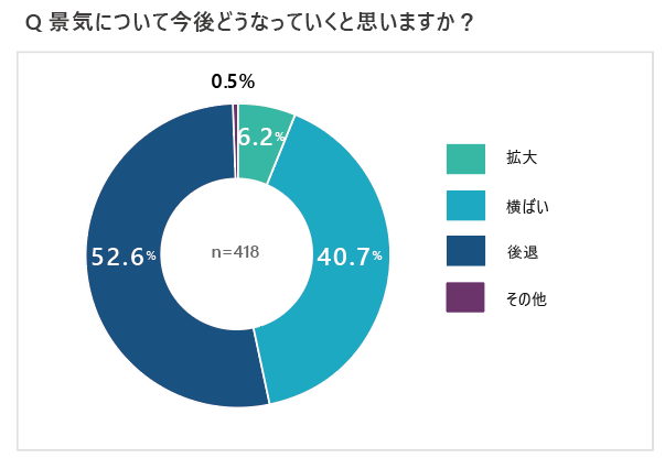 まずは「国内景気は今後どのように変化していくと思いますか?」と聞いたところ、約6%の方が「拡大する」、約40.7%の方が「横ばい」、約52.6%の方が「後退する」と回答しました。