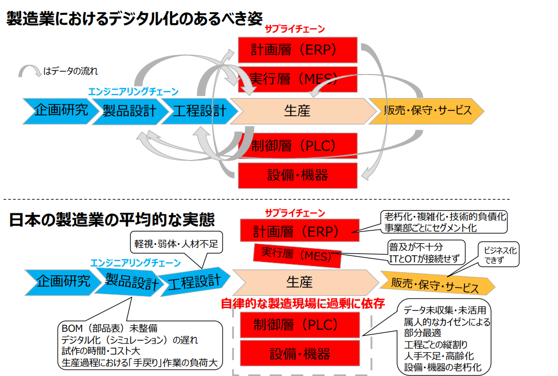 現在のメーカー(製造業)における課題は幾つかあります。少子高齢化による人手不足・属人化により部分最適・設備の老朽化などです。本来、あるべきサプライチェーンの形になっていないことが多く、生産性の向上につながっていきづらいのが現状です。