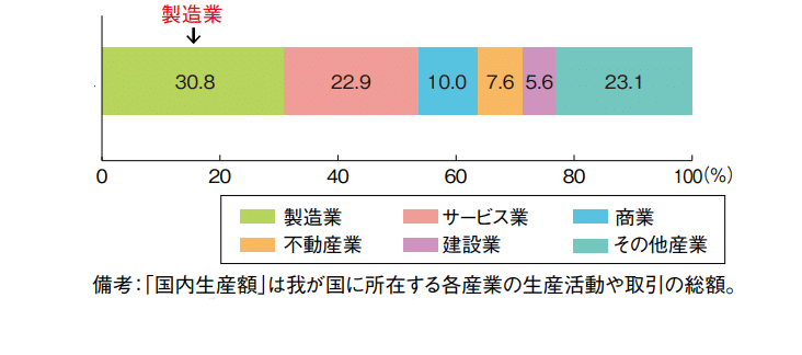 国内生産額(売上に相当)の産業別構成比をみると、「製造業」が30.8% と一番比率が高くなっており、「サービス業」の22.9%、「商業」の10.0% と続いております。我が国において製造業(メーカー)の役割が重要であることが見て取れます。日本の製造業(メーカー)の売上規模は、2022年で約390兆円です。日本の製造業(メーカー)は、自動車、電子部品、化学工業、機械工業、食品工業などの分野で世界をリードしています。また、日本の製造業(メーカー)は、輸出産業であり、日本のGDPの約3割を輸出によって生み出しています。