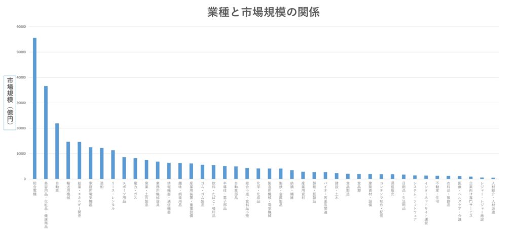 市場規模だけでみると、CMやお店で普段目にすることの多い「総合電機メーカー」や、現在注目されている「自動車」や「エネルギー開発」、「半導体」などの業種が上位にくる形になっていますが、BtoBの業界も市場規模が大きいところも多いです。