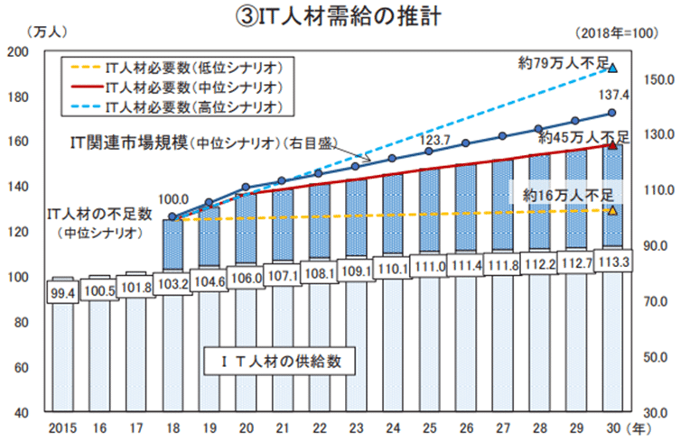 依然として人材不足が叫ばれるIT業界ですが、データが示す通り、人材供給は右肩上がりではあるものの将来的にそれを大きく上回る人材不足が予測されています(中位シナリオでも2030年時点で45万人不足)。