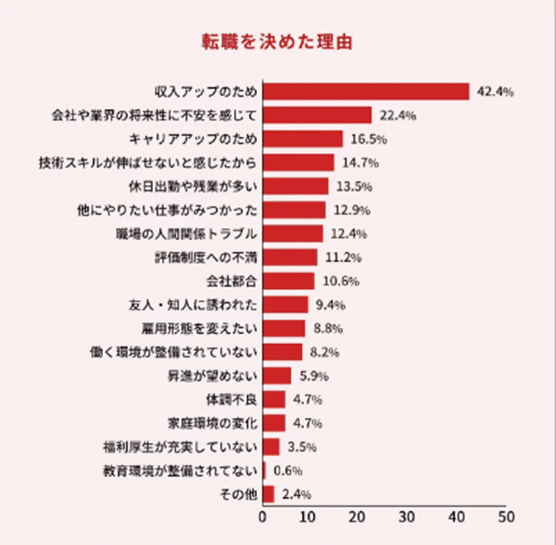 会社や業界の将来性に不安を感じて、技術スキルが伸ばせないと感じたから、休日出勤や残業が多い、評価制度への不満、雇用形態を変えたい、働く環境が整備されていない、昇進が望めない、福利厚生が充実していない、教育環境が整備されていない。
