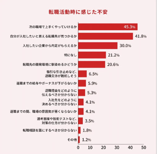 特になしというのは情報を扱うのに長けているITエンジニアらしい回答にも感じられますが、それでも転職に不安はつきものです。そんな不安は情報不足によるものが多いと考えられます。インターネット上の情報をうまく集めること、集めた情報をうまく活用することはもちろん、転職経験者からの情報や応募先企業からの情報など集めにくい情報にいかにアプローチするかが理解できれば、解消できるものだと思います。