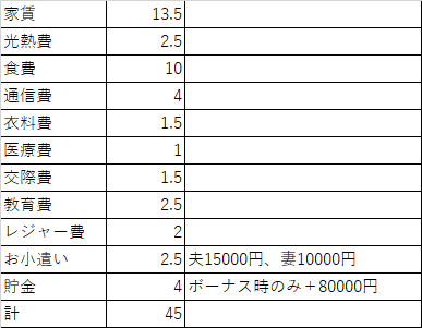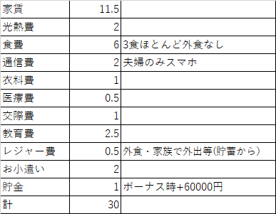 子どもが保育園・幼稚園に入園している場合の金額です。保育園や幼稚園の費用は平均的に毎月2万~4万円がかかりますが、今回は4万円に設定しました。 共働きの場合、貯金に回せるのが毎月3.5万円程度になります。食費については外食を含めた費用になっているので、生活水準を落とさなくても満足できる生活ができるでしょう。