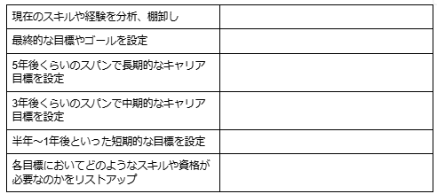 細かい目標を達成するためには資格が必要なのか、特定の業務での経験が必要なのか、ということを考えることによって、これからの自身の行動をより鮮明にイメージすることができます。