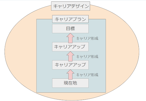 また、キャリアプランに似た考え方として、キャリアアップ、キャリア形成、キャリアデザインなどが挙げられます。これらの全体図は以下のとおりです。