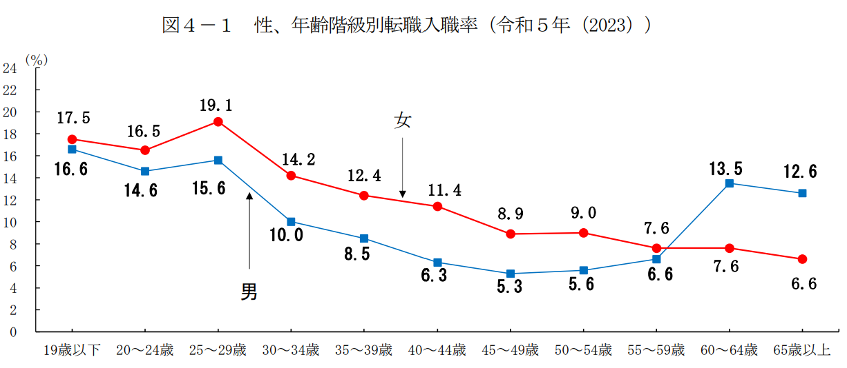 厚生労働省の「令和5年雇用動向調査結果の概況」によると、年齢が上がるにつれて転職入職率が下がる傾向があり、50代は全年齢に比べてやや低い結果です。これは、50代の転職難易度が高いことを示唆しています。