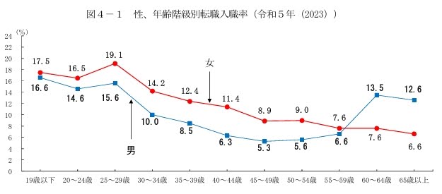 男性よりも女性のほうが転職入職率が高い理由は、正社員だけでなくパートやアルバイトといった雇用形態も含まれているためです。ただ、全体的に見ても30代後半から転職入職率が下がる傾向にあるため、早めの転職活動を心がけましょう。