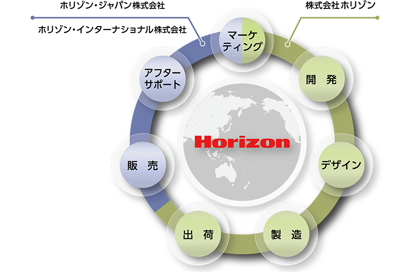 より付加価値の高い製品を提供するため、製品の企画から、開発、製造、販売のすべてをホリゾングループ内で一貫して手掛けています。この一気通貫体制がホリゾンの強みです。