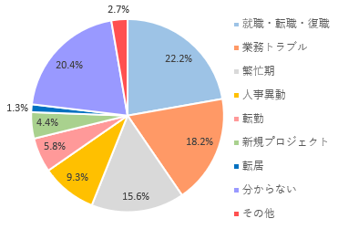 続いて「業務トラブル」18.2%、「繁忙期」15.6%、「人事異動」9.3%、「転勤」5.8%と、仕事面での環境変化によるものが回答の大多数を占めています。