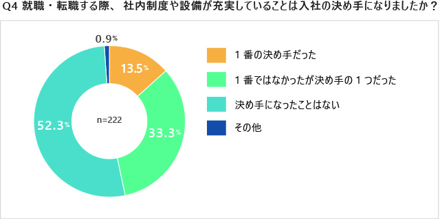 就職・転職する際に、社内制度や設備が充実していることが入社の決め手になったかどうか調査をした結果、半数は「決め手になった」という回答が得られました。働き方の多様化が注目されるこれからの時代、ますます「社内制度の充実」を気にする求職者は多くなっていくのではないでしょうか?