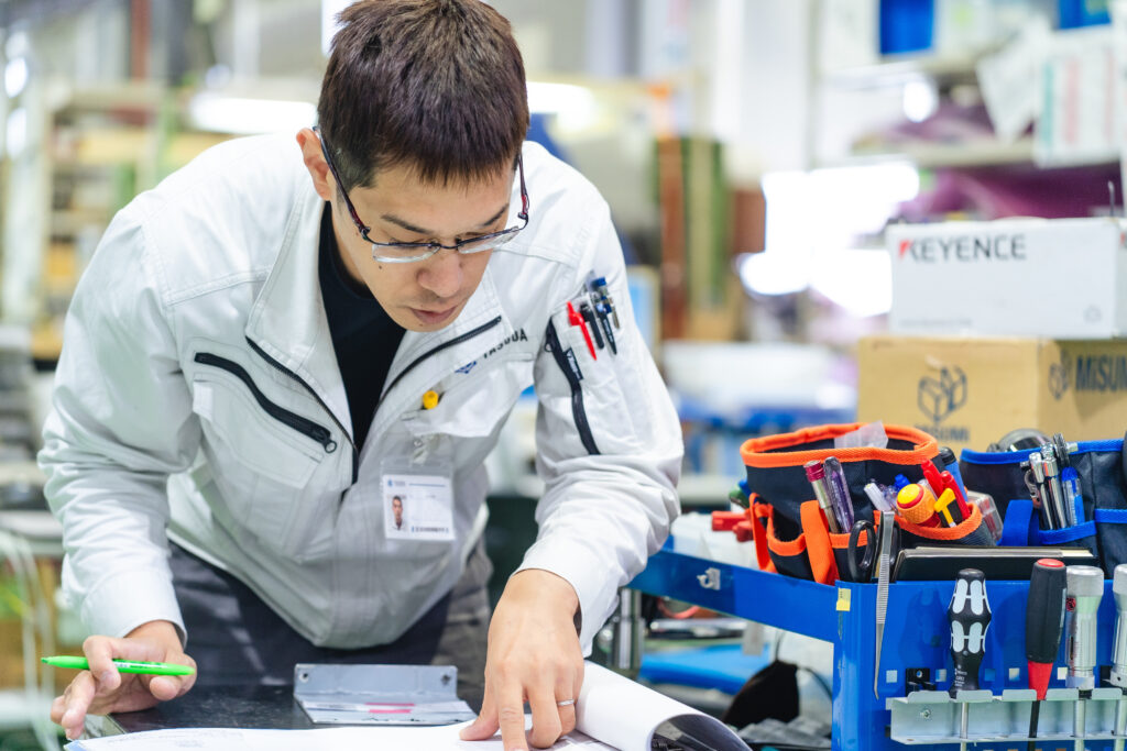 営業の場合もエンジニアの場合も、まず当社の全体像を把握するための研修プログラムを受けていただきます。営業の場合は、まず入社後に営業部門で1ヶ月、工場で2ヶ月。エンジニアの場合は、まず営業部門で1週間、工場で2ヶ月。その後、各部署を1週間単位でまわり、当社業務の基本的な内容を網羅的に学んでいきます。これは、社内のさまざまな部署の人々との関係づくりを最初に行うためでもあります。当社の仕事は、営業もエンジニアも、自分のデスク上だけで完結するものではありません。「この装置をベースに、こんなスペックにしてほしい」「こんなふうにカスタマイズしてほしい」といった、ひとつひとつの顧客ニーズに応えるため、他部署のメンバーと課題解決に向けて協働することが重要です。多くの人々に助けを求めながら、どんな提案をするかを考える方が、面白くなおかつスムーズに仕事が進みます。そうした関係づくりをまず行えるようにしようと、この研修プログラムも社員からのボトムアップで誕生しました。
