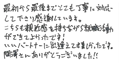最初から最後までとても丁寧に対応して下さり感謝しています。こちらも親近感を持ちながら就職活動ができてよかったです!いいパートナーに出会えて嬉しかったです。間澤さんありがとうございました!!