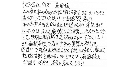 株式会社タイズ 前田様 この度は私の初めての転職活動をサポートいただきありがとうございました‼ご面談等を通じて私の志望内容を的確に把握いただき、希望条件にマッチした求人を厳選してご提案いただけたからこそ、早期に転職先を決めることができました! また、面談前後のフォローや私の質問に対しても迅速にご対応いただけたことが、とても心強く、安心して転職活動を進めることができました。前田様にご担当いただき、本当に良かったです‼
