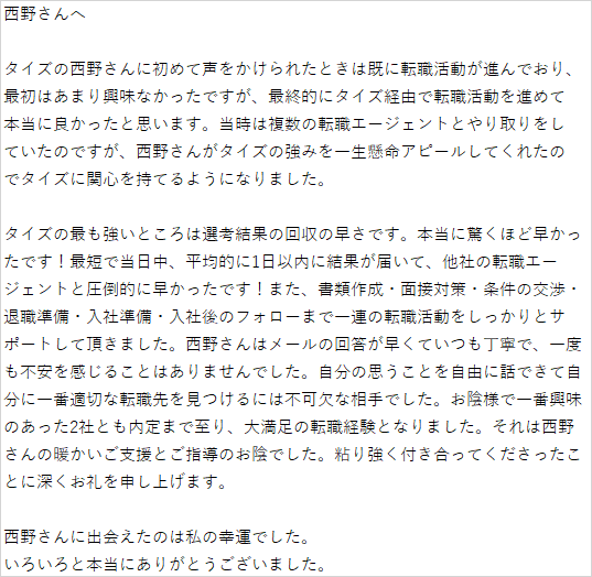 タイズの転職支援サービスを利用して転職された方より、 ご感想・メッセージをいただいております。