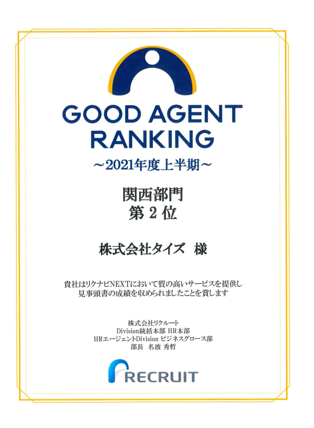 タイズが「GOOD AGENT RANKING ~2021年度上半期~関西部門で第2位」で表彰されました。